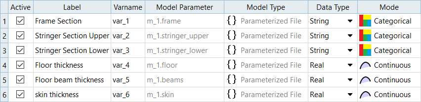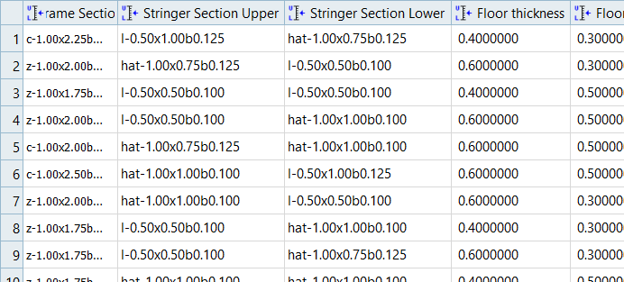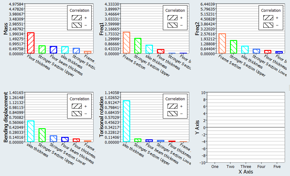The relative effect of a input variable can vary from output response to output response. The most influential input variables when analyzing frequency output responses are Frame Section and Stringer Section Upper. In contrast, the most influential input variables when analyzing the two stiffness conditions are Skin thickness and Stringer Section Upper.