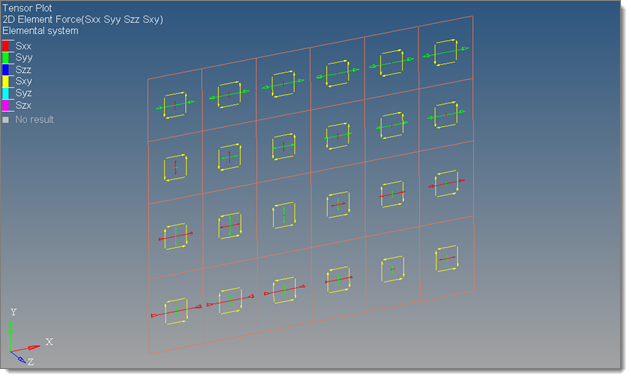 - Fx and Fy are the normal forces acting on the x and y faces of the 2D element below and are represented by the XX and YY components in the Regular drawing mode of the tensor plot in HyperView.