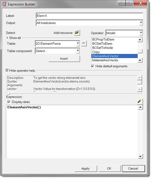 The element x-axis vector can be added to the list of datatypes by double clicking ElementAxisVector from the Model Operator. Use a meaningful label so this expression can be identified amongst the other vector datatypes while plotting.