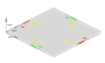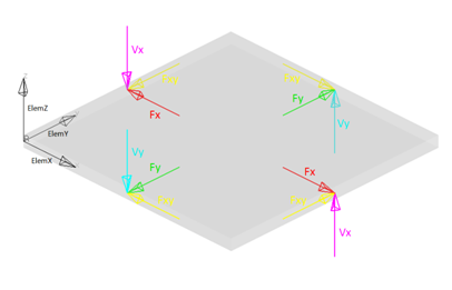 In order to visualize element forces and moments with a proper sense of orientation, the element x-axis must first be identified. Refer to the CQUAD4/CTRIA3 documentation in the Radioss, MotionSolve, and OptiStruct Guide for more information on how to define the element x-axis for 2D elements.