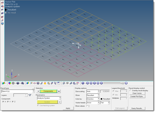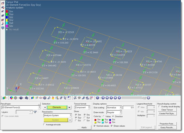 - Regular drawing mode will plot a traditional full tensor for each element. This is typically used for stress and element force tensor plots, and useful to properly visualize tensor transformations.