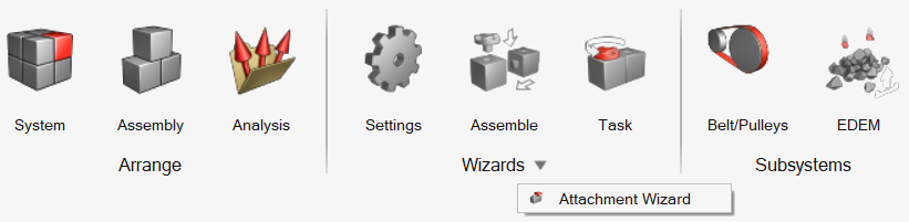 システム、アセンブリ、解析の作成と編集、ウィザードによるモデルの構築、ベルト / プーリー、NLFEスタビライザー、NLFEスプリングの作成と編集、EDEMおよびTrack Builderツールへのアクセス。