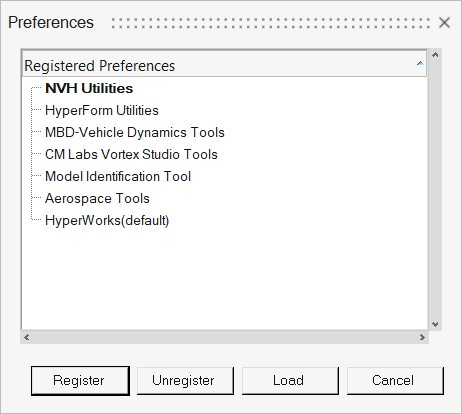 - PreferencesダイアログでNVH-Utilitiesを選択し、Loadをクリックします。NVHメニューがメニューバーに追加されて表示されます。