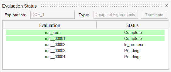 Evaluation Statusダイアログが開きます。このダイアログで各実行の進捗を追跡できます。