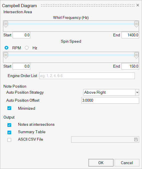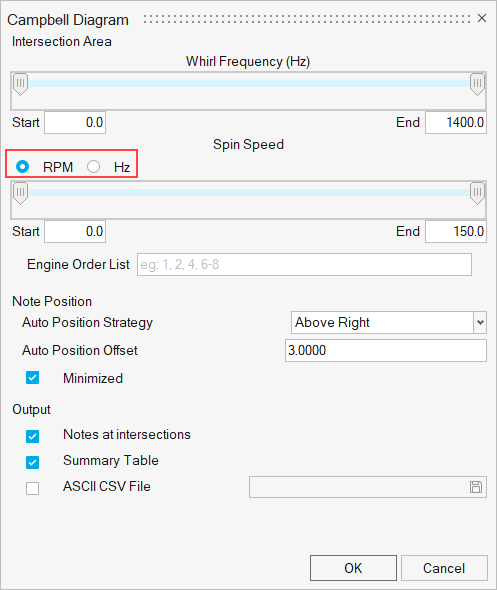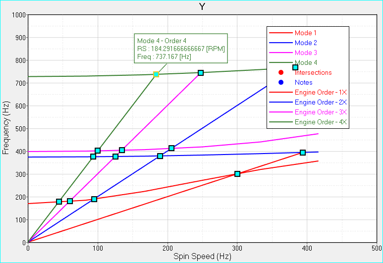 10. X軸の単位にRPMを使用している場合、Campbell Diagramダイアログ内のEngine Order List欄に1-4と入力します。結果は次のようになるはずです: