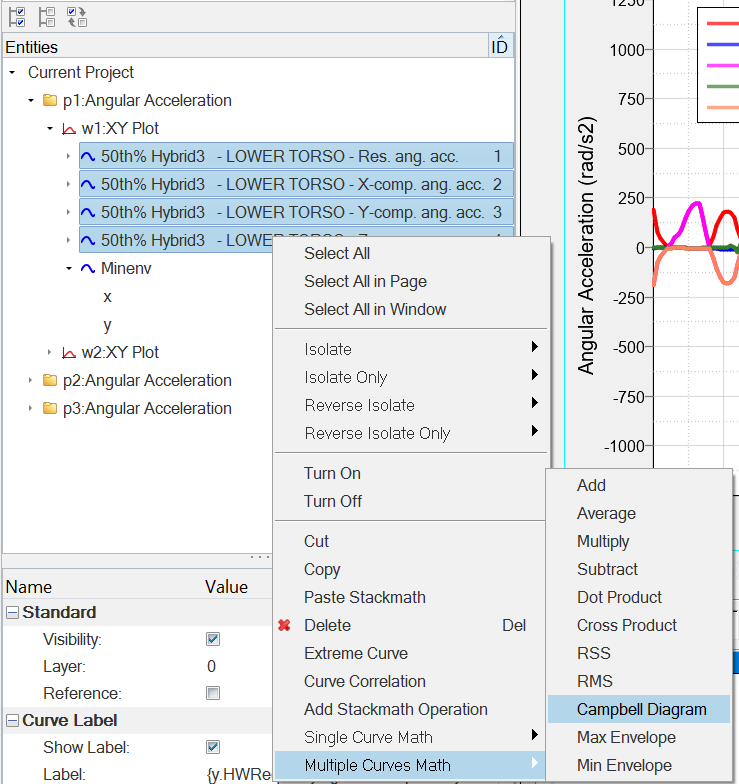 4. Plotブラウザからすべてのモードを選択し、右クリックして Multiple Curves Math > Campbell Diagramを選択します。