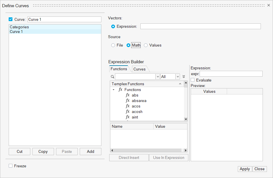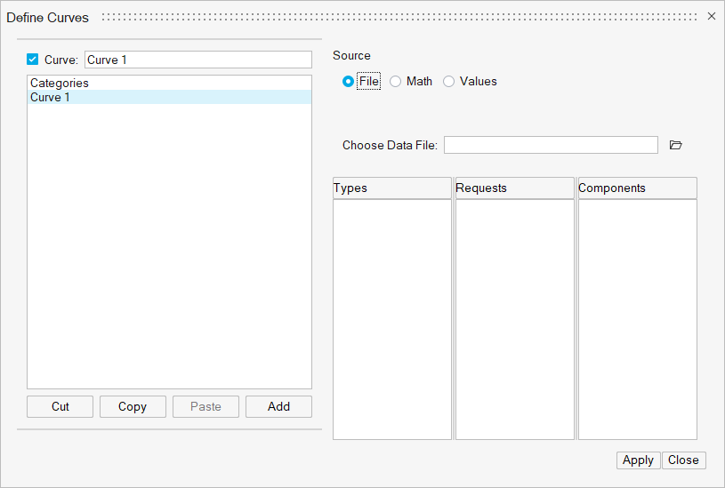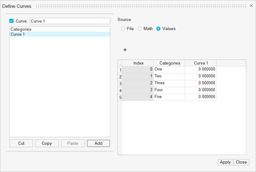 - データポイント値は、Values表のCurve列に直接入力できます。Curve列に数値を入力し、Applyをクリックします。カーブがカーブリストに追加され、Curve列がCategories列の横に表示されます。デフォルトでは、新しいカーブは、Curve 1、Curve 2、... のように命名されます。Curveリスト内の棒グラフカーブの名称を変更すると、Values表のCurve列のヘディングも変更されます。