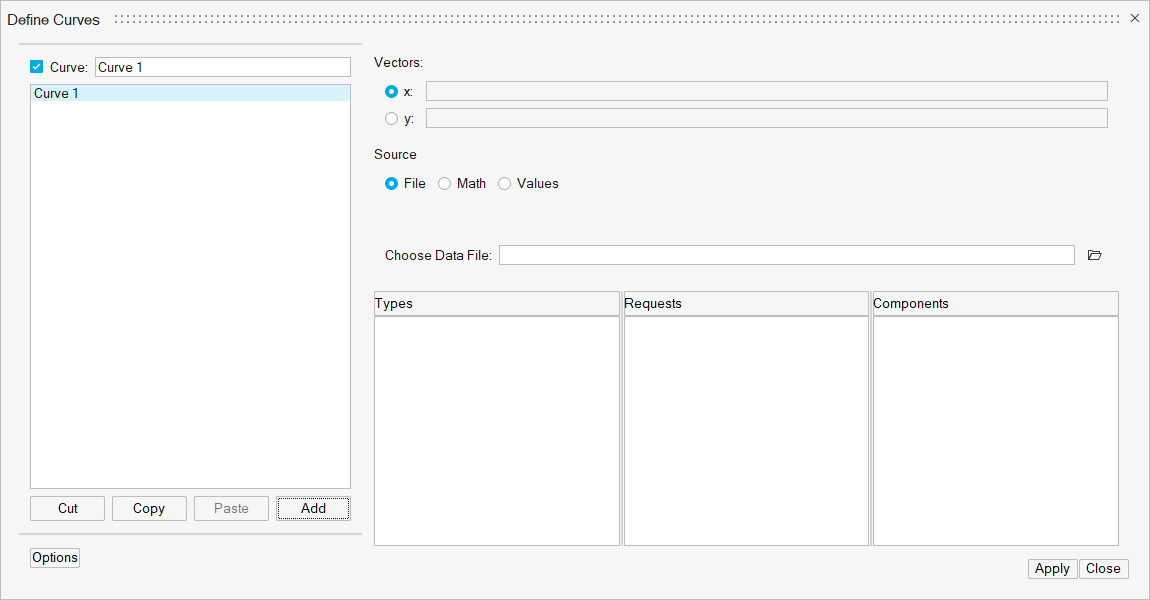 データソースとしてFileを選択した場合、ファイルブラウザを使用して、XベクトルとYベクトルのデータファイルを選択します。リストビューから、サブケース、タイプ、リクエスト、コンポーネントを選択します。図 1.
