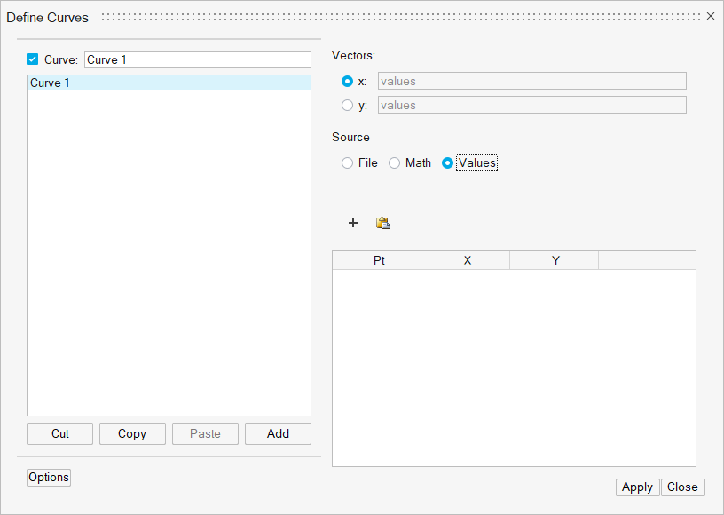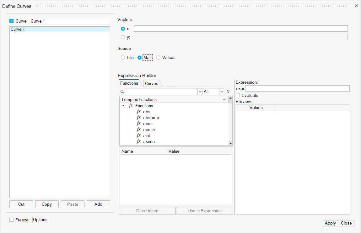 カーブは、XデータベクトルおよびYデータベクトルで構成されています。XおよびYベクトルは、データファイルから読み込み、数式で定義、または、値として入力することができます。カーブのXおよびYベクトルは、同じソースのものである必要はありません。例えば、カーブのXベクトルのデータソースをASCIIファイルとし、同じカーブのYベクトルのソースをsqrt(x)等の数式で定義することが可能です。