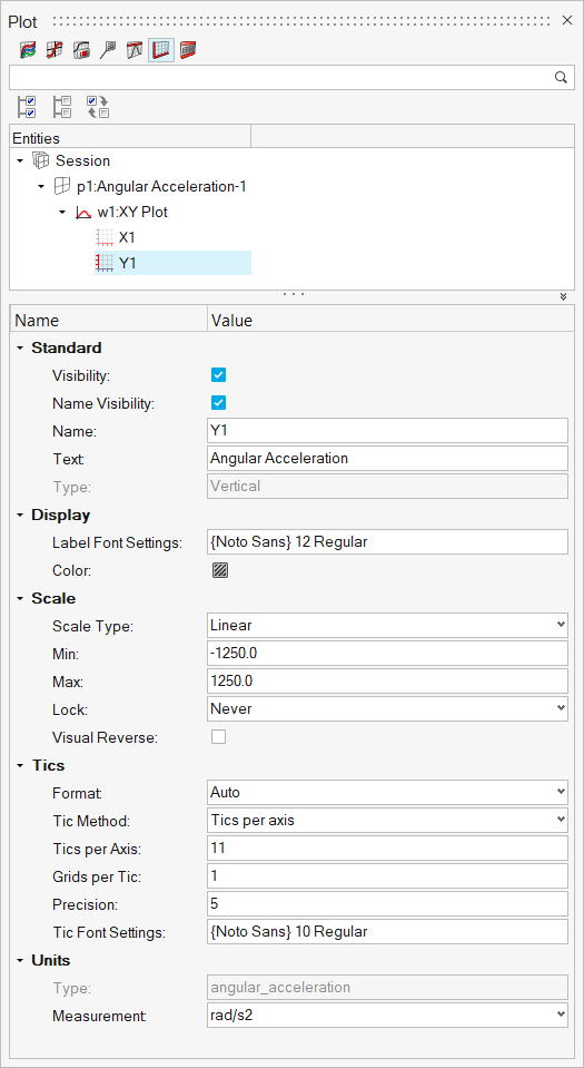 は、セッション内の軸のみを、対応するページおよびプロットフォルダーにグループ化して表示します。軸をクリックすると、そのプロパティがエンティティエディターに表示されます。