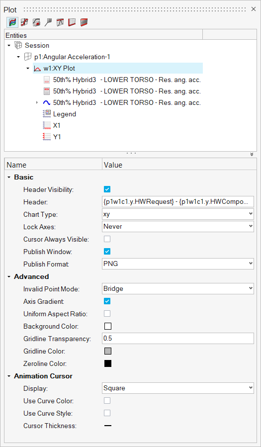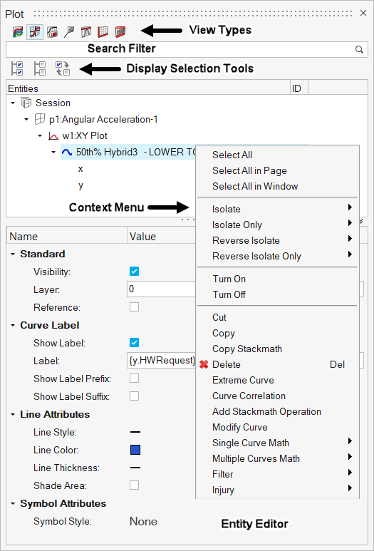 Plotブラウザのツール群では、現行のセッション内のプロットデータの検索、表示、編集を行うことができます。Plotブラウザからは、エンティティを1つずつ、もしくは共通の選択手法を使って同時に複数選択することが可能です。エンティティは、Plotブラウザのコンテキスト(右クリック)メニューでも選択できます。HyperGraphパネルにある操作の多くはPlotブラウザで実行できるため、プロットやカーブのプロパティを一箇所で変更することが可能です。これらの操作の一部には下記が含まれます: