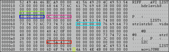 AMFヘッダーは基本的にはMicrosoft AVIヘッダーと同じです。ただし、HyperGraphなどのAMFファイルリーダーは、ヘッダーブロックの部分的な情報を使用します。AMFファイルのHEXダンプの以下の部分に注目してください。AMFリーダーで使用される部分がハイライト表示されています。図 1.
