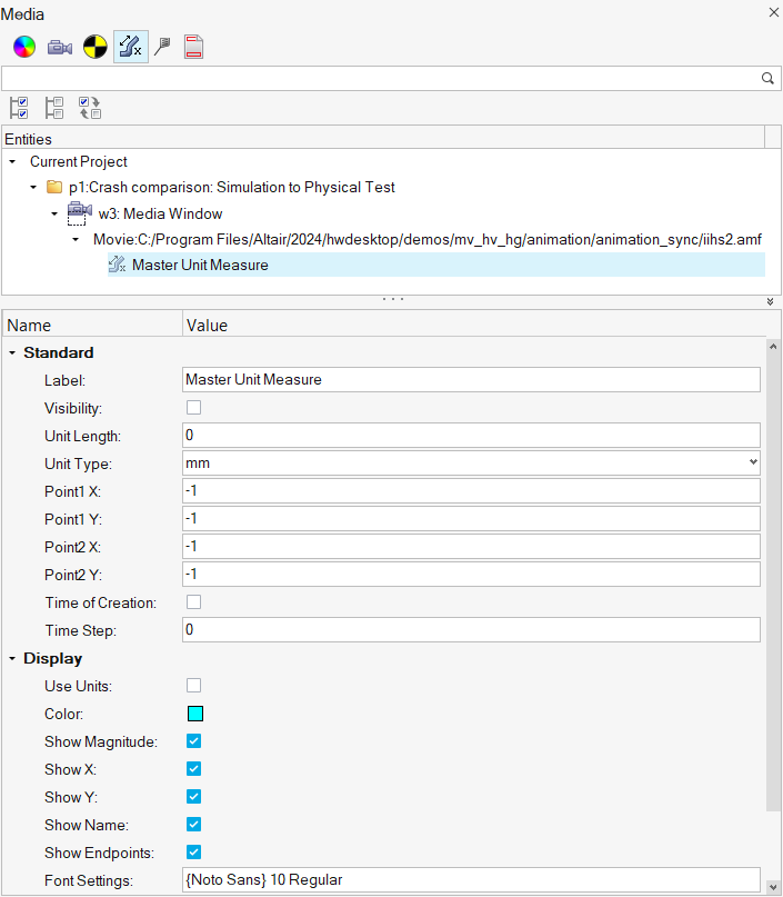 Master Unit Measureが定義されていない場合、単位オプションはデフォルトで無効です。定義されると、このオプションは自動的にアクティブとなり、チェックマークが入ります。これは、Magnitude、Delta X、Delta Yの値を示す際、およびメジャーから生成されたカーブをプロッティングする際に、定義済みの単位およびMaster Unit Measureで定義された画素変換係数を使用しなければならないということを指定します。これは、すべてのメジャーに適用される全体的なセッティングです。