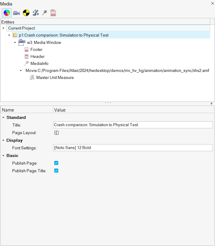 Mediaブラウザビュータイプ(Media Window、Movies、Markersなど)が選択されると、Mediaブラウザツリー上部のページフォルダーを選択して、ブラウザの下半分(Properties Table)にプロパティを表示することができます。