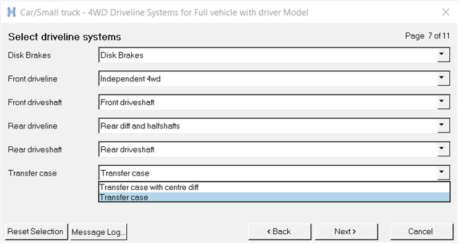 MotionViewの乗用車 / 小型トラックライブラリでは、フロントとリアのドライブシャフトを駆動するために粘性力が使用されます。メカニズムのタイプは、ウィザードによる選択を通して車両モデルを構築するときに、“4WD Driveline Systems”ページで選択できます。図 1. 4WD設定のトランスファーケースのオプション