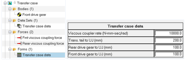 - トランスファーケースのパラメータ、特にカプラー定数 / 比は、トランスファーケースシステムで提供されるフォームを使用して編集できます。