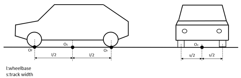 作用力は、4輪の中心とサスペンションの中心Of とOr 地面の高さにある路面上の基準点Oc にかかります。