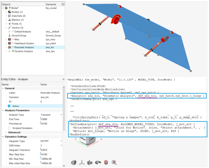 - このモデルには、2つのシステムインスタンスとそれらの定義ブロックとは別に、キネマティックアナリシス(ana_kin)をインスタンス化する*Analysisステートメントがある。このアナリシスインスタンスは、モデルファイルの*DefineAnalysisブロックにあるアナリシス定義(def_ana_kin)を参照する。