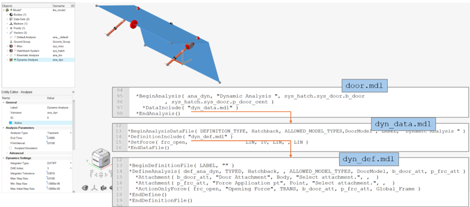 - MDLでは、*BeginAnalysisブロックを使用して配布アナリシスがインスタンス化される。このブロックには、データファイルを参照する*DataIncludeステートメントがある。このデータファイルには*BeginAnalysisDataFileブロックがあり、このブロックには定義ファイルを参照する*DefinitionIncludeがある。この定義ファイルには、*DefineAnalysisブロックを持つ*BeginDefinitionFileがある。この構造は、アセンブリエンティティの構造と一致している。