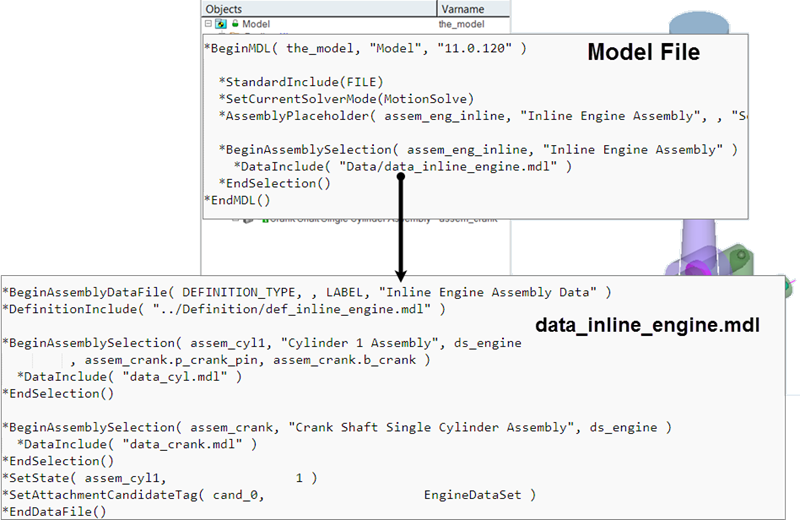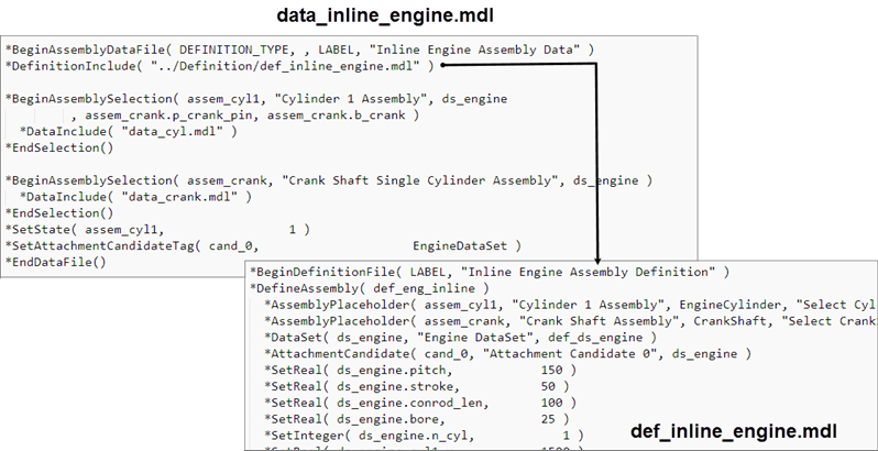 下の図は、MDL言語を用いてこのアセンブリを定義する方法を示しています。モデルMDLファイルには、*BeginAssemblySelectionブロックを参照する*AssemblyPlaceholderステートメント(assem_eng_inline)が記述されています。このブロックには、Inline Engine Assembly(data_inline_engine.mdl)のデータファイルを参照する*DataIncludeステートメントが記述されています。