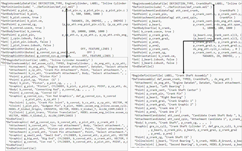 このデータファイルは、*BeginAssemblyDataFileの親ブロックを擁します。このデータファイルでは、*DefinintionIncludeステートメントを介してdefinition file def_inline_engine.mdlを参照します。この定義ファイルは、“Cylinder 1 Assembly”と“Crank Shaft Assembly”のためのアセンブリプレースホルダを*DefineAssemblyブロック内に含む、この最上レベルのアセンブリの定義を有しています。また、この定義ファイルにはデータセットの定義も含まれます。対応する*BeginAssemblySelectionブロックはデータファイルにあります。これらのブロックは、それぞれシリンダーアセンブリ(data_cyl.mdl)とクランクシャフトアセンブリ(data_crank.mdl)のデータファイルを参照します。データファイルには、定義内のエンティティに関連したデータも含まれます。