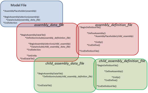 データファイルは、アセンブリ定義ファイルを参照する*DefinitionIncludeステートメントを保持する*BeginAssemblyDataFileブロックを収めています。この定義ファイルは、*DefineAssemblyブロックにエンティティの定義を収めています。また、システム、データセット、テンプレートなどの定義ベースのエンティティのインスタンス化に使用する他の*Defineブロックも置くことができます。*DefineXXXブロックはすべて、*BeginDefinitionFileブロックにあります。