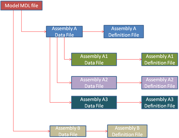 アセンブリ階層はその深さに制限がなく、MDLシンタックスには、それが使用されている階層のレベルに関係なく、一貫性と独立性があります。下の図は、モデルがそのモデルツリーのルーツとは別にアセンブリ(複数可)を持つことができることを示しています。これらのアセンブリはそれぞれ、1つの関連付けされたデータファイルを参照します。また、これらのアセンブリデータファイルはそれぞれ、1つの定義ファイルを参照します。