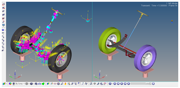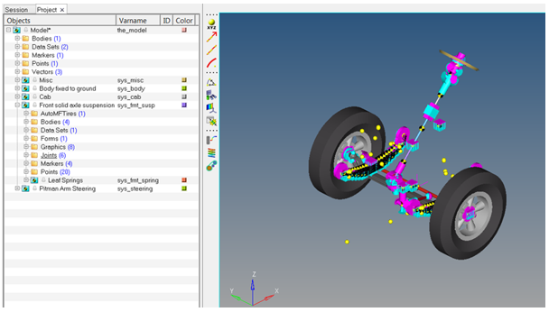 例えば、Front end of truckセクションでの手順に従い、Assembly Wizardを使用してフロントサスペンションモデルを構築します。これで、完全なフロントサスペンションが構築されました。
