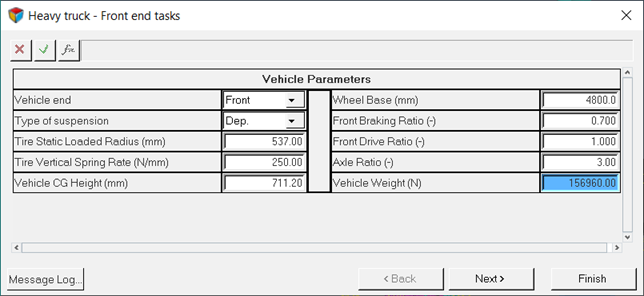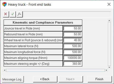 注: ライド解析、ロール解析、ステアリング解析、静的荷重解析の詳細については、フロントサスペンション解析タスクトピックを参照してください。