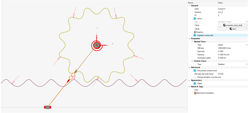 上の例は、カーブ群とそれらの間に定義された2次元接触を含んだラックとピニオンを示しています。矢印が指している(外側の)ピニオンの側は、接触する可能性がある側を示しています。同様に、ピニオンカーブ上の矢印は、外側からそれを指している矢印群を有しています。