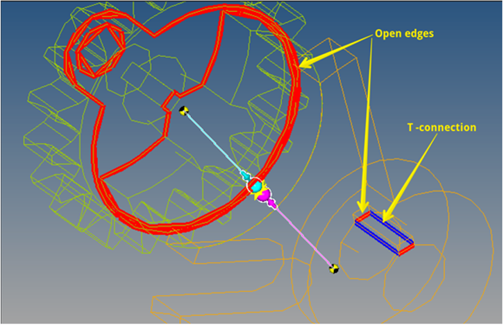 - 接触に関連する個々のグラフィックスは、閉じたボリュームを形成する必要があります。すなわち、グラフィックメッシュには、オープンエッジやT接合が含まれていてはいけません。オープンエッジやT接合をチェックするには、Highlight mesh errorsオプションを使用します。オープンエッジは赤いラインで、T接合は青いラインでハイライト表示されます。視認性を高めるには、関連するグラフィックコンポーネントの描写を影なしモードに切り替えます。注: メッシュエラーが検出されなかった場合は、このオプションが無効になり、No mesh errorsが表示されます。