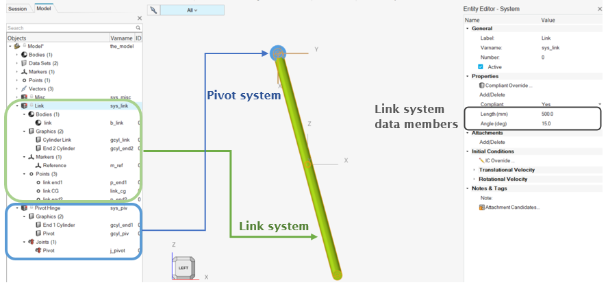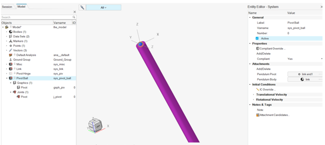 - このシステムでは、リンクは、参照マーカーの原点において回転ジョイントを使用して拘束され、Z軸に沿った方向を向きます。リンクボディと参照マーカーは異なるシステム(リンク)内にあるため、モジュール性を維持するために、これらのエンティティはアタッチメントとしてPivot systemに入力されます。