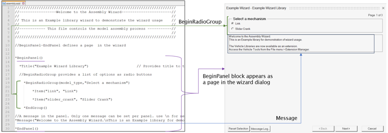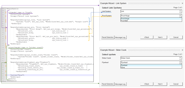ウィザードには複数のBeginPanelブロックを含めることができます。終了時に、MotionViewは各パネルで選択されたシステムをインスタンス化します。また、アタッチメントの解決も行います。