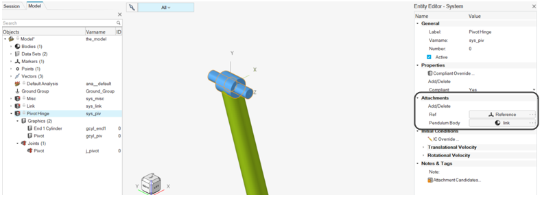 - ジョイントPivot – RefマーカーのZ軸に沿ったRefマーカーの原点にあるアタッチメントPendulum BodyとGround Body間の回転ジョイント。注: 原点とアライメント軸は、Advanced Selectionを使用してアタッチメントの子属性を参照するように解決される必要があります。