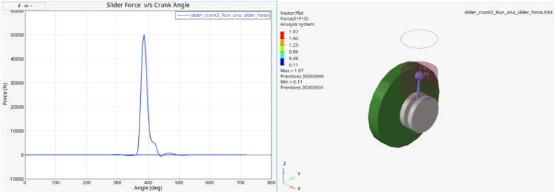 - レポート - このレポートは、クランク角度に応じてピストンにかかる力をプロットし、その横にはアニメーションを表示します。