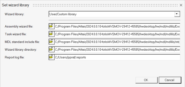*Reportによって参照されているレポートテンプレートファイルもライブラリにコピーします。*Report内のパスがアナリシス定義ファイルを基準にしていることを確認してください。Example Wizardに関連付けられたファイルは、~install\hwdesktop\hw\mdl\mdllib\Example_wizardにあります。