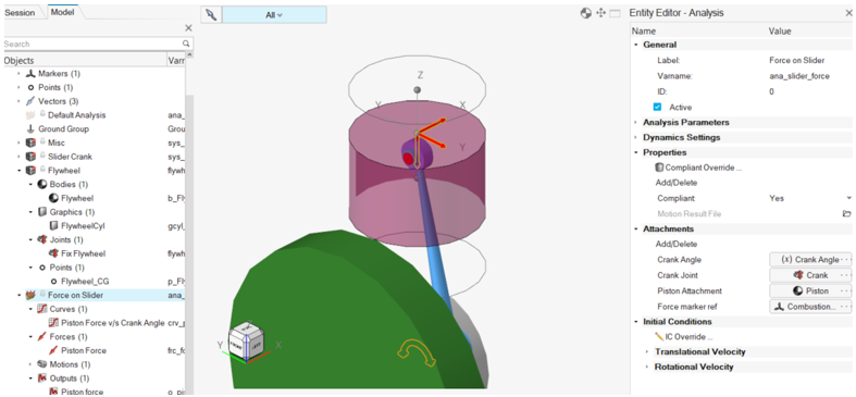 - アタッチメント - Crank Angle(ソルバー変数)、Crank Joint(ジョイント)、Piston Attachment(ボディ)、Force marker ref(マーカー)。