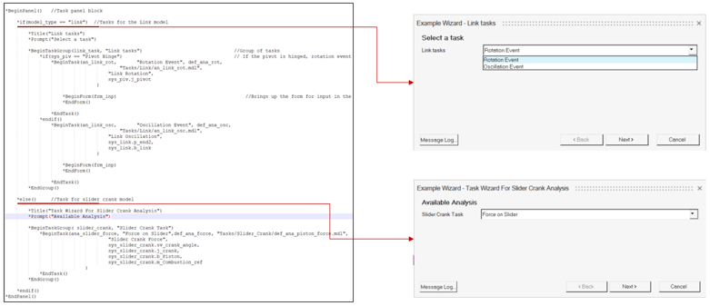 - 各タスクは、定義ファイル(mdl)内のアナリシス定義を参照する*BeginTask()ブロックを使用して定義されます。アナリシスへのアタッチメントも、このブロックの引数として渡されます。