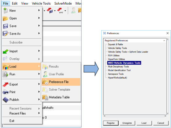 MBD-Vehicle Dynamicsツールは、プリファレンスファイルとして読み込む必要があります。