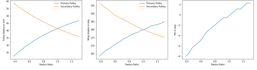 プーリーとバリエーターの半径比と形状情報があれば、プーリーの実行半径、ラップ角、軸方向変位はいつでも算出できます。バリエーターのベルトは剛体と見なされます。