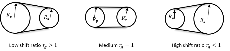 シフト比を計算するには、CMMモデルを使用します。CMMモデルに従って、プライマリプーリーとセカンダリプーリーのクランプ力比が静止クランプ力比と同じでない場合、バリエーターのベルトが移動します。静止クランプ力とは、ベルトが平衡を保ち移動することのないクランプ力の比です。