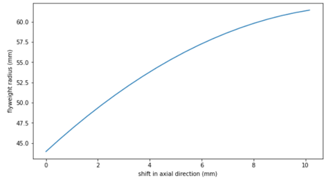 下のカーブは、シャフト中心線からのローラーの距離()とプライマリプーリーのシーブの軸上のシフト()の関係を示しています。