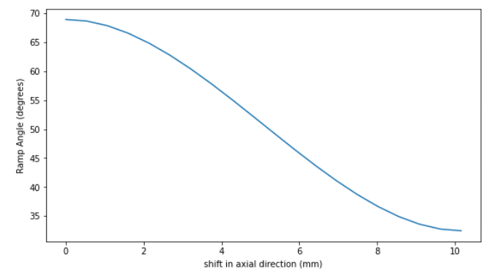下のカーブは、ランプ角()とプライマリプーリーのシーブの軸上のシフト()の関係を示しています。