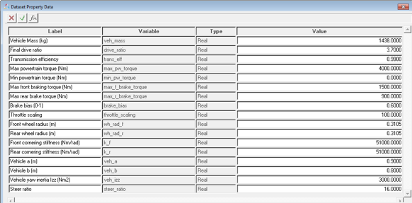 一部のドライバーコントローラー(フィードフォワードコントローラー、ギアシフトコントローラー)は、車両情報を必要とします。この情報は、データセットを使って提供され得ます。これらのコントローラーが使用されていない場合、このデータセットは取り込む必要がありません。グラフィカルユーザーインターフェースは自動的にこれらのデータセットを入力します。図 1.
