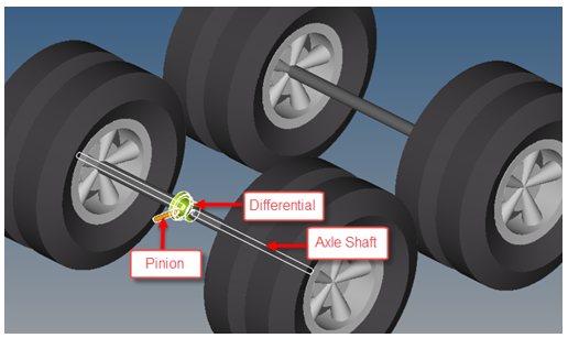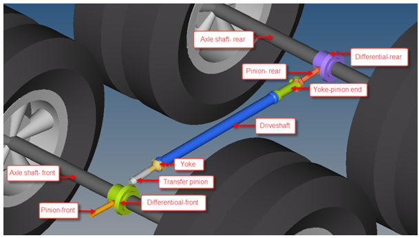 1アクスルドライブラインとの違いは、2アクスルドライブラインには、車両前方のトランスミッションから車両後方のディファレンシャルに至るドライブシャフトシステムがあることです。ドライブシャフトはヨークを介して結合されているので、サスペンションが垂直方向と縦(長手)方向に動くことができます。2アクスルドライブラインに組み込まれた主なボディパートを以下の図に示します。図 2.