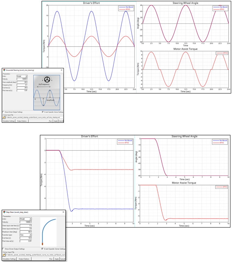 Sinusoidal SteeringやStep Steerイベントなどのステアリング操作シミュレーションは、EPASシステムの挙動を理解するのに役立ちます。以下の図では、表示されたイベント設定について、これら2つのイベントを示し、全く同じ操作を行ったステアリングブーストシステムなしの車両と結果を比較しています。