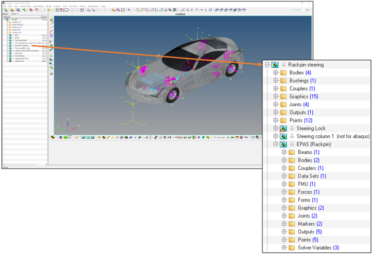 Assembly Wizardで所定の選択を完了すると、Altair DriverとElectric Power Assisted Steeringシステムを搭載したフルビークルモデルが得られます。図 13.