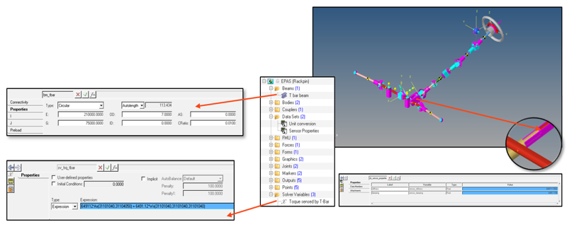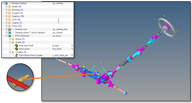 - MotionViewのモーターパートは、モーターの慣性特性を表すボディ、およびパワーステアリングシステムと相互作用するラックボディによるラックアンドピニオンカプラーで構成されています。