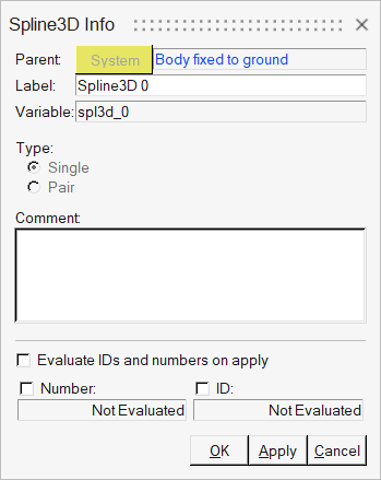 | ID | ソルバー入力デックへ書き出す際にエンティティを識別するため、任意のエンティティに整数のID番号を割り当てることが可能です。MotionViewでは、ソルバー入力デックにエンティティが書き込まれるときに、ID欄が空白のすべてのエンティティに自動的にIDが割り当てられます。エンティティペアは、左右にIDをもち、それぞれがペア内の各エンティティに割り当てられたIDを表わします。 |