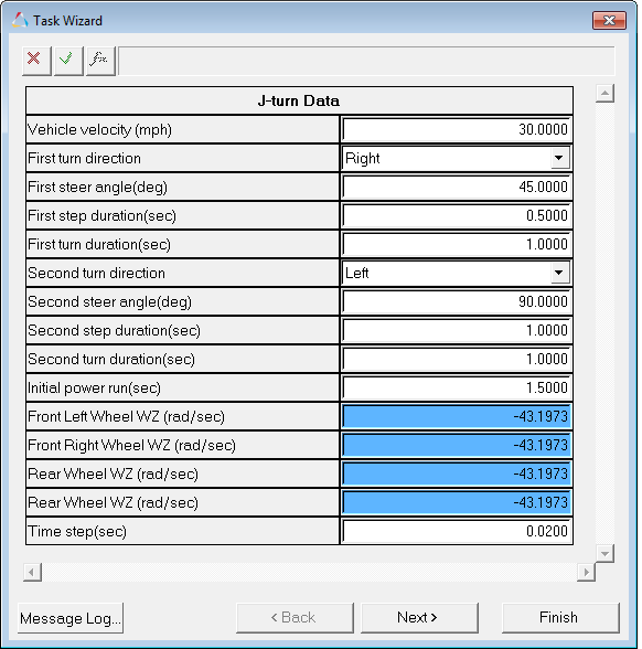 フォームは、イベントのデータを変更する必要のある唯一の場所です。ステア入力のタイミングと大きさは、フォーム上で変更できます。ホイールのWZ値は、イベントフォーム上で入力した初期速度と、タイヤシステムフォームにあるタイヤ転がり半径を使用して計算されます。
